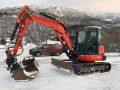 2012 Kubota KX057-4 minigraver med tiltrotator og tre skuffer, kun 4408 timer. Maskinen er servet av kvalifisert verkstedpersonale, og har nettopp fått montert nye belter. Sertifisering gjelder til april 2026. Leveres med smalskuff, kabelskuff og pusseskuff, noe som gir god fleksibilitet til ulike graveoppgaver.